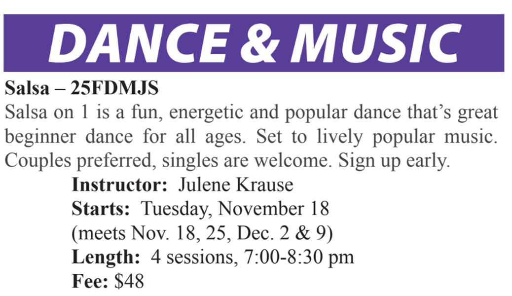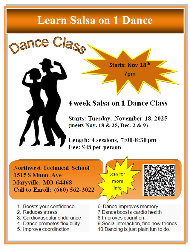 Salsa 4 week Salsa on One Class at Northwest Technical School 1515 S Munn Ave, Maryville, MO 64468, US (660) 562-3022 Salsa is an energetic dance that’s easy to learn. Join us as we step with rhythm on the dance floor. Dancing is great exercise and is fun for all ages. Space is limited! Sign up early.